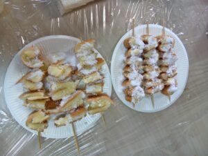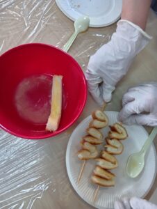 本日のお菓子づくりプログラムでは、食パンを使って2品に挑戦しました。