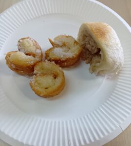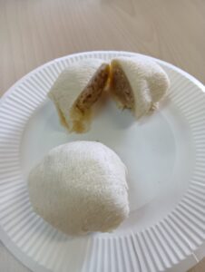 次は、パンの部分を使った即席肉まん。冷凍のシュウマイをパンで包み、レンジで温めてからオーブンで焼くと、ふっくらアツアツに。机を囲んで「肉まんだ!」と笑いながらほおばり、自然と会話も弾みました。