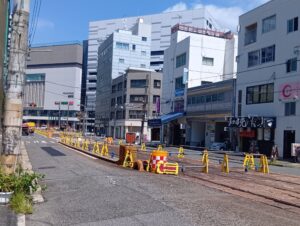 廃線区間では、電停や線路を撤去して道路へ転用する工事が進行中。重機の音を聞きながら、「ここに新しい景色が生まれる」と未来を想像。安全に配慮し、誘導に従って見学しました。
