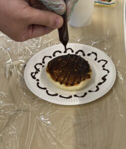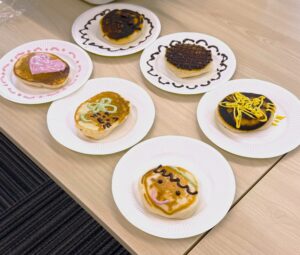 焼きあがったホットケーキは、チョコペンやアイシングで思い思いにデコレーション。顔やハート模様など、個性あふれる楽しい作品が並びました。