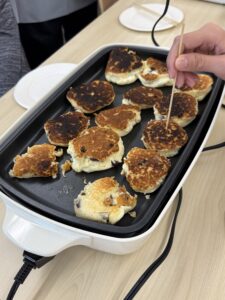 材料を混ぜ合わせる工程では、生地のかたさに少し苦戦しながらも、「もう少し混ぜた方がいいかな?」「手伝いますよ!」と声をかけ合いながら、皆さんで協力して進められていました。